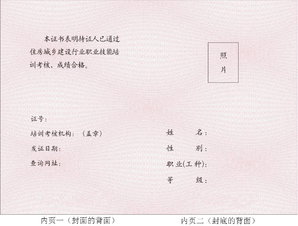 住房城鄉(xiāng)建設(shè)行業(yè)技能人員職業(yè)培訓(xùn)合格證(以下簡(jiǎn)稱(chēng)職業(yè)培訓(xùn)合格證)由封面、封底和內(nèi)頁(yè)組成,主要內(nèi)容包括:證書(shū)名稱(chēng)、監(jiān)制單位、持有人基本信息、培訓(xùn)的職業(yè)(工種)及等級(jí)、證號(hào)、培訓(xùn)考核機(jī)構(gòu)名稱(chēng)及印章、發(fā)證日期、查詢網(wǎng)址、證書(shū)說(shuō)明等(詳見(jiàn)圖1、圖2)。