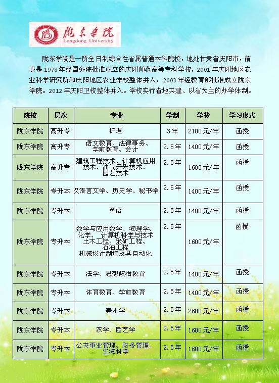 隴東學(xué)院位于甘肅慶陽(yáng)市。是一所實(shí)行省地共建、以省為主的多科型全日制普通本科院校。學(xué)校是蘭州大學(xué)、華東師范大學(xué)等院校的合作院校,與美國(guó)北亞利桑那大學(xué)、洪堡州立大學(xué)、曼斯菲爾德大學(xué)及臺(tái)灣中國(guó)文化大學(xué)等13所院校建立了校際合作交流關(guān)系。