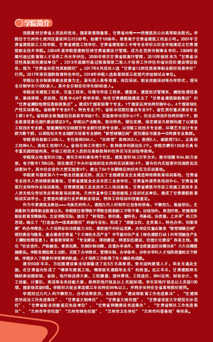 我院是經甘肅省人民政府批準、國家教育部備案、甘肅省內唯一一所建筑類公辦高等職業院校。學院位于蘭州市七里河區晏家坪三村200號,始建于1958年,原隸屬于甘肅省建筑工程總公司。2001年甘肅省建筑職工工程學院、甘肅省建筑工程學校、甘肅省建筑職工中等專業學校三校合并組建成立甘肅建筑職業技術學院。2004年底學院整建制劃轉甘肅省建設廳管理,成為全民所有制事業學校,2008年底順利通過教育部人才培養工作水平評估,2009年移交甘肅省教育廳管理,2010年被批準為“甘肅省示范性高職院校建設單位”,2013年底順利通過教育部第二輪人才培養工作評估和省示范校建設項目驗收,現為“甘肅省示范性高職院校”。2017年6月成功入選“甘肅省13所優質高等職業院校培育學校”行列。2017年榮獲國防教育特色學校。2018年學院入選教育部第三批現代學徒制試點單位。